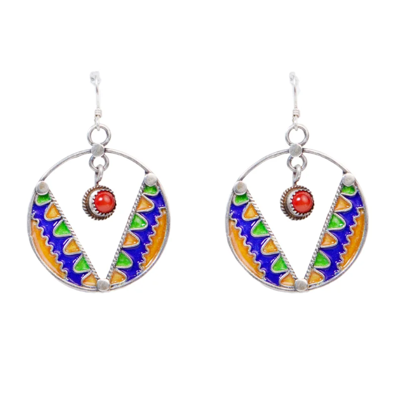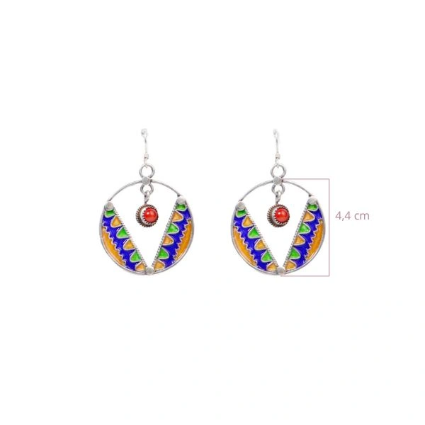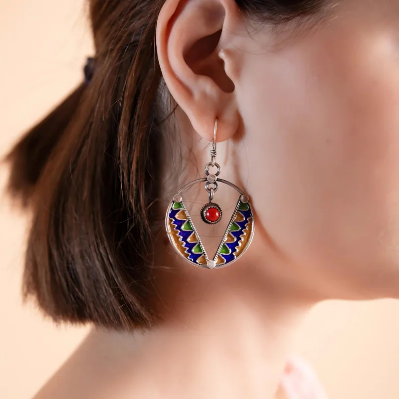 The Oasis Tazoughert Silver Earrings – Jouhra are inspired by the tranquility and vitality of the desert, symbolizing the enduring spirit of Queen Tazoughert. The circular shape with wave-like lines represents the continuous flow of life, while the rich colors evoke the fertility and nourishment of an oasis in the desert. This design captures the balance, resilience, and deep connection to nature that defined the queen’s reign.